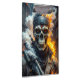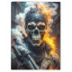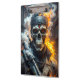 Libere o poder desta impressionante obra de arte, apresentando um crânio formidável com olhos brilhantes, pronto para a batalha contra as forças da perdição. Vestida com couro preto elegante e armada com uma arma de fogo, a figura exala intensidade e resiliência. Chamas ardentes, fumaça e cinzas giram ao fundo dramático, amplificando o sentido de ação e perigo. Perfeita para colecionadores que apreciam visuais ousados e dinâmicos e temas sombrios e atmosféricos, esta peça certamente fará uma declaração poderosa em qualquer espaço.