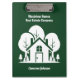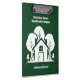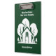 This forest green real estate company clipboard is perfectly customized for a realtor who specialized in houses near the wilderness or woodlands. The white silhouette of trees behind a log cabin home and personalized with your agent and realty business name for marketing in the backwoods.