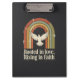 Um retrorreflector colorido arco-íris e design de fé pomba que mostra a mensagem 'Rootado na fé, ascensão no amor'