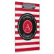 Design de monograma elegante em círculos com decoração floral sobre fundo listrado branco e vermelho