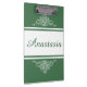 Design floral elegante com decoração de nomes e listras sobre fundo verde e branco