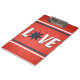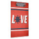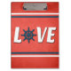 Design náutica de amor com roda de vela e decoração de listras em fundo vermelho grunge