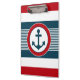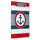 Design náutico com decoração em forma redonda com âncora sobre fundo listrado a azul, vermelho e branco