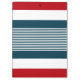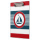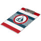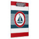 Design náutica com decoração em forma redonda de embarcações à vela, em fundo listrado, a azul, vermelho e branco