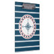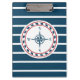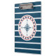Design náutico com decoração em forma de bússola, em fundo listrado a azul e a branco