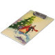 Old English Dickens style Christmas illustration with a family standing in the snow in front of a Christmas tree with bright burning candles.