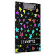 Este divertimento, características de design coloridos da prancheta um teste padrão das formas da estrela de vários tamanhos e coloridas uma variedade de cores em um fundo preto. Igualmente caracteriza um nome personalizado.