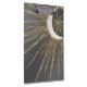 Esta design estética magnífica, mística, solar e lua crescente mandala universo é perfeita para decoração domiciliar, visto cotidiano ou eventos especiais encantados. Um bonito e caprichoso design de sol dourado e mandala da lua, com flores e folhas de rabisco, estrelas, pontos, diamantes, círculos, triângulos e formas geométricas em escala de sereia, com uma lua brilhante palco crescente, uma estrela da flor da mandala, feita com folha de ouro falsa, em uma nebulosa de cinzas escuras, estrelas de galáxias e um fundo gradiente de cinza.