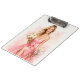 A beautiful woman in a flowing pink dress holds a bouquet of flowers and a pair of high heels in this elegant watercolor illustration.