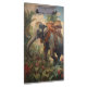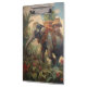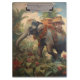 pintura em vintage de uma cena botânica com um carregando elefante um howdah caminhando por um rio com um palácio índio nas costas rodeado por plantas e árvores exóticas