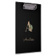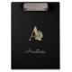 A área preta elegante apresenta um monograma botânico dourado no centro.