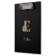 A área preta elegante apresenta um monograma botânico dourado no centro.