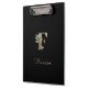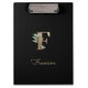 A área preta elegante apresenta um monograma botânico dourado no centro.