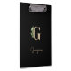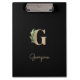 A área preta elegante apresenta um monograma botânico dourado no centro.