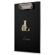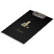 A área preta elegante apresenta um monograma botânico dourado no centro.