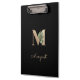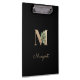 A área preta elegante apresenta um monograma botânico dourado no centro.