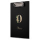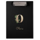A área preta elegante apresenta um monograma botânico dourado no centro.