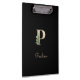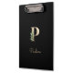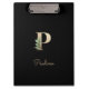 A área preta elegante apresenta um monograma botânico dourado no centro.