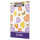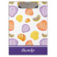 Tome notas com esta área de transferência apresentando um padrão colorido de conchas vermelhas, amarelas e violetas na aquarela, evocando uma viagem de penteamento na praia. Personalize-o adicionando seu nome usando as fontes disponíveis.