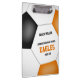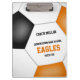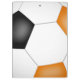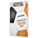 Esta prancheta temática de futebol para o treinador de futebol masculino ou feminino apresenta a imagem de uma bola de futebol laranja, preto e branco de tamanho abstrato sobre a qual você pode personalizar o nome do treinador mais o nome da escola e mascote e ano/estação escolar - por katz_d_zynes