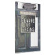 Um design de arte da antiga porta do serviço de reservas na plataforma da estação ferroviária, com um aviso de não admissão e cuidado dos comboios da era do comboio a vapor.