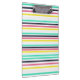 Uma área de transferência com um padrão listrado colorido. A área de transferência tem um clipe metálico no topo para prender os papéis com segurança. As listras estão em várias cores, incluindo amarelo, rosa, azul e preto. A cor de fundo é branca.