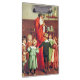Lovely nostalgic vintage illustration of Papa Noël, or Father Christmas, blowing a horn while cute little children are cheerfully dancing hand in hand in a circle around him.