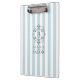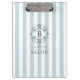 Um design de inspiração europeia em faixas de avisos brancas e azuis em francês, esta prancheta personalizada tem um quadro de rolagem desenhado à mão em torno do seu monograma. Mostrada aqui como uma prancheta de salões de cabelo, ela também faz uma boa escolha para uma butique, spa, cuidados com a pele, café, restaurante, designers, indústria da moda, designer de joias e outros negócios profissionais. Também pode ser adaptado para uso pessoal editando o texto com o texto desejado.