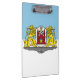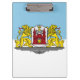 Clipboard with design with flag of Riga, capital city of Latvia; white and blue flag with coats of arms with two golden lions holding a shield in the center