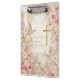 Organize seus planos e projetos em uma prancheta de elegância divina com a prancheta personalizada Heavenly Blush & Dourado Quince com foto. A frente desta bela área de transferência apresenta um design sereno e espiritual com tons suaves de pincel, delicados sotaques florais e detalhes de ouro em ximersão. A bela ilustração inclui pombas graciosas em voo e uma magnífica cruz ouro. No verso, você pode adicionar sua própria e carinhosa fotografia, fazer esta prancheta de transferência de uma forma verdadeiramente única e profundamente pessoal. Esta prancheta é perfeita para organizar planos partidários, acompanhar documentos importantes, ou como um presente ponderado para uma Quinceañera ou marco religioso. Combina arte encantadora com uma ferramenta organizacional prática, garantindo que ela possa manter seus itens de precioso seguros e sólidos. Façam-no exclusivamente dela! A frente desta adorável área de transferência oferece texto personalizável, permitindo que você adicione uma mensagem especial, um nome ou uma data significativa. Imaginem "Isabella's Sweet 15" ou "Abençoado com o Amor" exibido elegantemente na frente. No verso, um belo retrato do celebrante ou uma foto da família cria um lembrete permanente dessa ocasião alegre. A área de transferência personalizada do Heavenly Blush & Dourado Quince com foto é mais do que apenas uma área de transferência; é uma pequena obra de arte que serve como um belo e sincero lembrete de uma ocasião alegre e sagrada.