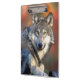 Fotografia do lobo. Os amantes do lobo amarão esta fotografia. Outono cénico agradável fundo colorido. Lobo cinzento/cinzento com olhos amarelos.