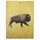 Uma pintura digital do bison americano, ou búfalo, sobreposta a uma imagem de fundo em couro bronzeado. O bison (Bison bison), o maior mamífero terrestre da América do Norte, é considerado uma espécie-chave: já vagaram pelo continente em rebanhos de excelente, e sua pressão de pastagem ajudou a moldar a ecologia das planícies Excelentes. Foram descritas duas subespécies ou ecótipos: a bisão (bison bison bison), de tamanho menor e com uma corcova mais arredondada, e a bisão de madeira (Bison bison athabascae) - a maior das duas e com uma corcova quadrada mais alta. O bison é um relativo recém-chegado à América do Norte, tendo se originado na Eurásia e migrado pelo estreito de Bering Há cerca de 10 mil anos substituiu o bisão-estepe (Bison priscus), um imigrante anterior que era muito maior. Pensa-se que a bisão de estepe se extinguiu devido à mudança do ecossistema e à pressão da caça na sequência do desenvolvimento do ponto de Clovis e da tecnologia conexa, e à melhoria das capacidades de caça. Nesse mesmo período, outras megafaunas desapareceram e foram substituídas até certo ponto por animais eurasiáticos imigrantes mais bem adaptados aos humanos predadores. O bisão existente, tecnicamente uma forma anã, foi um desses animais. Estima-se que houve 20-30 milhões de bisontes, também chamados de búfalos, em roaming na América do Norte. O seu alcance, em tempos, incluía aproximadamente um triângulo entre o Excelente Bear Lake, no extremo noroeste do Canadá, a sul, e os estados mexicanos de Durango e Nuevo León, e a leste, ao longo da fronteira ocidental das montanhas Appalachian. As primeiras vias férreas da América do Norte, com exceção dos caminhos obliterados de mastodonte ou de musko, foram os traços feitos por bison e veado na migração sazonal e entre os campos de alimentação e os lamaçados salinos. Muitas destas rotas, marteladas por inúmeros cascos instintivamente a seguir a bacias hidrográficas e as cristas de serras para evitar a lama de verão e as derivas de neve de inverno em lugares baixos, foram seguidas por Americanos nativos e foram inestimáveis para os exploradores. O termo "búfalo" pode ser considerado um erro para este animal, uma vez que está apenas distantemente relacionado com qualquer um dos "verdadeiros búfalos", o búfalo asiático e o búfalo africano. No entanto, "bison" é uma palavra grega que significa "animal parecido com boi", enquanto "búfalo" se originou com os caçadores franceses de peles que chamavam estes boeufs gigantes de bestas, que significam bois ou bullock - por isso ambos os nomes, "bison" e "búfalo", têm um significado semelhante. Em relação a esse animal, o termo "búfalo", que data de 1635, tem uma história muito mais longa do que o termo "bison", que foi registrado pela primeira vez em 1774. O bisão americano está mais relacionado ao bisão sábio ou europeu. A caça não regulamentada de bisão, que culminou em abates em massa nos anos 1870, reduziu a população para 1.091 em 1889. Hoje, cerca de 500.000 bisontes vivem na América do Norte. A maioria não é pura bisão, mas as preferencialmentes foram cruzadas com bovinos no passado e são criadas como gado em fazendas. Menos de 30.000 bisontes estão em manadas de conservação, e menos de 5.000 estão livres e livres de doenças. Hoje, bisontes estão ecologicamente extintos ao longo da maior parte de sua faixa histórica, exceto alguns parques nacionais e outras pequenas áreas de vida selvagem. O Parque Nacional de Yellowstone tem a maior população de bisão de planícies de roaming livre (cerca de 4.000), e o Parque Nacional de Buffalo de Madeira tem a maior população de bisão de madeira de roaming livre (cerca de 10.000). Um bison tem um casaco de inverno marrom, comprido e escuro, e um peso mais leve, casaco de verão marrom mais claro. O casaco de inverno é tão grosso e bem isolado que a neve pode cobrir as costas sem derreter. O bison masculino é ligeiramente maior que as mulheres. O bisonte das planícies pesa normalmente de 700 a 2.200 lbs. O maior touro selvagem já registrado pesava 2.800 lbs. Quando criado em cativeiro e cultivado para carne, o bisão pode crescer de forma não natural pesada e o maior bisonte semimdoméstico pesava 3.800 lbs. As cabeças e os quartos dianteiros são maciços, e ambos os sexos têm cornos curtos e curvos que podem crescer até 2 pés de comprimento, que usam para lutar pelo status dentro do rebanho e pela defesa. Bison são herbívoros, pastando nas gramíneas e bordas das pradarias norte-americanas. O seu calendário diário envolve períodos de duas horas de pastoreio, repouso e mastigação em cud, passando depois para um novo local para pastar novamente. Este movimento regular garante que bison raramente invade uma área. Bison frequentemente esfrega e rola no chão criando depressões ricas e como discos chamados wallows. Rolo de bisonte em wallow, wet or dry, cobrindo-se com pó ou lama. As explicações passadas e as hipóteses atuais sugeridas para o comportamento ao engolir incluem o comportamento ao aliciamento associado à desmoronamento, a interação homem-homem (normalmente o comportamento ao rubor), o comportamento social para a coesão do grupo, o comportamento ao brincar, o alivio da irritação cutânea devida a insetos picantes, a redução de carraças e piolhos, e a termorregulação. Ondas eram uma característica comum das planícies. No inverno, bison pode cavar por uma neve profunda com suas cabeças para alcançar a vegetação abaixo. Bison tem visão fraca, mas tem audição aguda e um excelente olfato. Bison pode alcançar velocidades de até 35 mph. Bison tem uma expectativa de vida de aproximadamente 15 anos na natureza e até 25 anos em cativeiro. Bison mate no final da primavera e no verão em áreas mais abertas. Durante o outono e o inverno, bisão tende a se reunir em mais áreas arborizadas. Durante esse tempo, bison compensa em comp