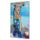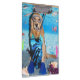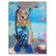 Esta prancheta caracteriza um golden retriever vestida como um snorkeler no oceano.