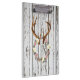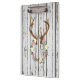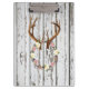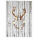 Uma grinalda rústica encantador das flores, dos galhos e das bagas pendurando nos antlers dos cervos contra um branco da casca pintou a parede de madeira da cabine. As flores e os antlers são um design da aguarela e a madeira é um efeito impresso olhar do vintage - madeira nao real.