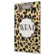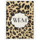 Ela está na moda e feroz como um animal selvagem. Este gráfico chic safari legal inclui um monograma de três letras onde a senhora pode adicionar um toque pessoal. Dourado, castanho, fundo de impressão do leopardo preto com um quadro em forma fofo e texto personalizável. Design Copyright © CuteComfy.com