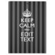 Um estilo personalizado de listras negras clássicas decor Manter Calmo e Continuar, dizendo em um presente personalizado. Humorístico ou caprichoso experimente suas palavras criativas nas duas linhas editáveis de texto. Lembre-se de usar letras CAPITAL para obter melhores resultados. Use o link "Mensagem" para entrar em contato conosco com suas solicitações especiais de design ou para obter assistência com seu projeto de personalização.