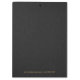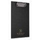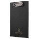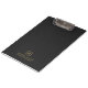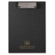 This clipboard design features a black linen-textured printed image with simple, minimalistic dark-gold customizable typography.
