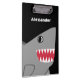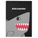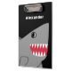 O tubarão bonito personalizado dos desenhos animados pretos cinzentos caçoa a prancheta. Fundo preto com um tubarão cinzento dos desenhos animados do divertimento que espreita para fora do canto. Personalize com nome na pia batismal branca do divertimento. A imagem do tubarão em ambos os lados deste divertimento caçoa a prancheta.