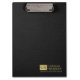 Design com um monograma personalizado em um quadrado dourado e um texto personalizado em tons dourados. Imagem de fundo de textura de couro preto.