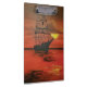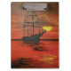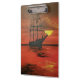 Arte original de Manuela Davis retratando uma silhueta de nave de cliper contra um céu vermelho refletindo sobre a água do oceano. embarcação marítima. Para fãs de navios e velejar.