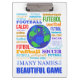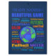 Futebol ou futebol? Aqui estão alguns de seus muitos nomes, em algumas línguas que são faladas internacionalmente e outras regionais ou nacionais. Design apresenta uma bola texturizada de futebol na forma de um globo refletindo um jogo que é popular no mundo inteiro. Designs em ambos os lados da área de transferência com uma face superior clara para escrevendo e uma parte inferior em cor escura prática.