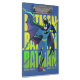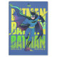 Veja este desenho animado de Batman correndo, com seu nome em cores elétricas atrás dele e as palavras "Nunca Desistir" embaixo.