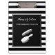 Mantenha formulários do cliente para seu cabeleireiro com esta prancheta horizontal larga preto e branco na moda do boutique da beleza das listras com uma escova e penteie o logotipo. Personalize adicionando o nome de seus salão de beleza e Web site a este teste padrão listrado preto e branco contemporâneo.