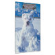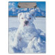 Foto de um cachorrinho fofo coberto de neve, parecendo um cachorrinho. "Saudações Snowy do nosso 'Pitt-snow-bull'! Desejando-lhe um Natal pejorativo e divertido!"