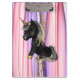 Um unicórnio branco, preto-e-água, com orelhas cor-de-rosa pastel e ouro-negro e rabo-preto, colocado numa cortina de cor roxa e rosa, com sotaques dourados. Uma adição colorida e exclusiva a um partido unicórnio.