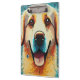 Esta ilustração feliz do Retriever de Ouros é um design excelente para amantes de cães e proprietários de Ouros de Retriever. Ele tem uma cor de fundo azul-esverdeada e se adequa à maioria das combinações de cores.