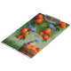 Dois pássaros azuis ocidentais percham numa árvore de pêssego, enquanto um terceiro pássaro azul se senta num cesto cheio de fruta recém-colhida pronta para comercialização. Trabalho de arte realista criada de uma pintura original de petróleo pelo artista da vida selvagem Crista S. Forest.