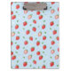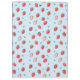 Um padrão lúdico cheio de morangos pintados à mão, pequenas flores brancas, e folhas verdes sobre um fundo pastel azul claro. Excelente para produtos com primavera ou impressões de tecido fofo.