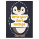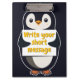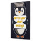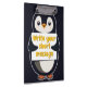 A friendly stylized penguin holds a sign with concise, attention-grabbing copy. The penguin's simple shapes, balanced silhouette, and clear facial expression convey warmth and approachability. The sign is positioned for easy readability, with generous negative space and a legible type style. The overall tone is upbeat and inviting.
