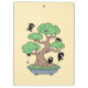 Simples ilustração de uma árvore bonsai japonesa em uma bandeja rasa. Um grupo de pequenos ninjas fez desta árvore a sua base. Vários ninjas estão escondidos atrás da folhagem. Um está balançando de uma corda amarrada a um galho, outro paira sobre a árvore amarrada a uma pipa.